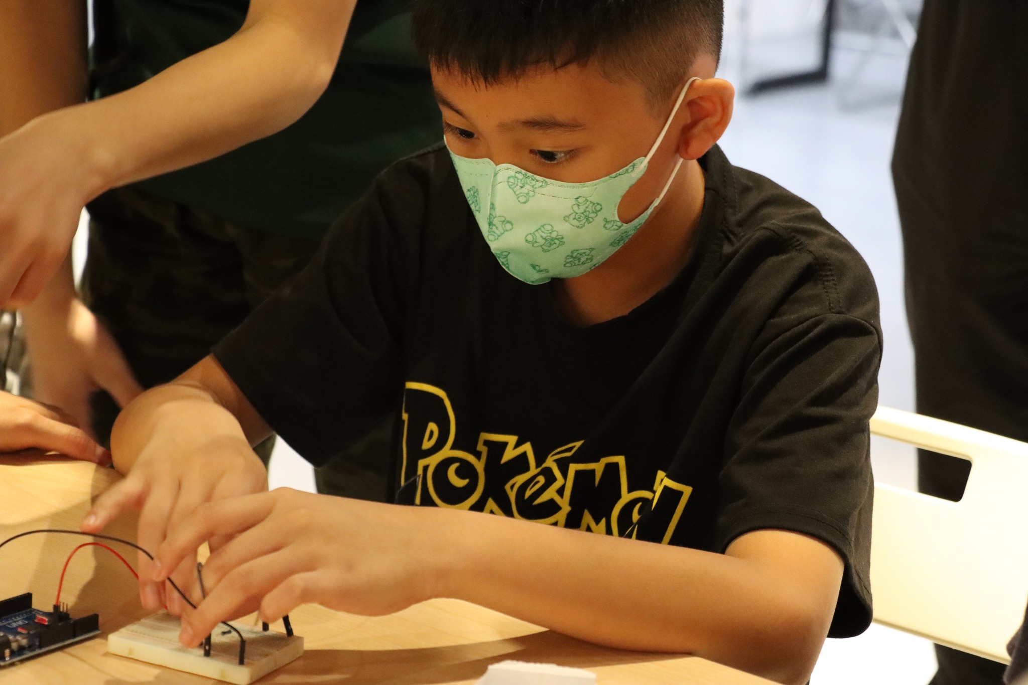 我們在帶領關卡的過程中,遇見了一對令人難以忘懷的母子。當天,這位男孩總是把握任何機會來到麵包板關卡,充滿好奇心的觀察與把玩桌面上的教材。更驚喜的是,在所有跑關活動結束後,男孩與媽媽再次出現了!他們熱切的想破解最後一道、最困難的題目,男孩極為專注的埋首於接通電路,媽媽亦積極的與我討論迴圈背後的原理。細問之下,才知道媽媽從事電子相關專業,她笑笑地說「不知道孩子對電子這麼有興趣,回去後要買一組麵包板讓孩子玩!」![]()
