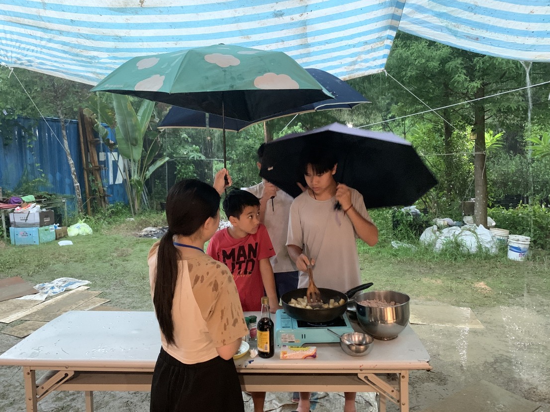 七月的第三週,我們再次來到台中,也凸顯了在關西的拇指園營隊,真的和「度假」一樣,一方面是因為台中場從早到晚是「零冷氣」,一方面也是因為這次沒有了上次的好運,遇上了鋒面,於是每天下午都是「豪雨狂炸」。我們經歷了在雨中撐傘煮飯、洗菜,在雨中打掃、整理環境,或是夜觀到一半下起了大雨。