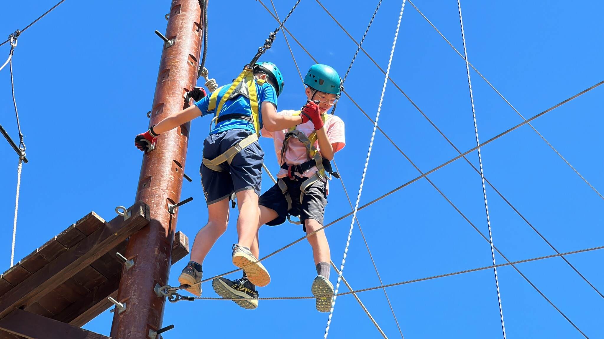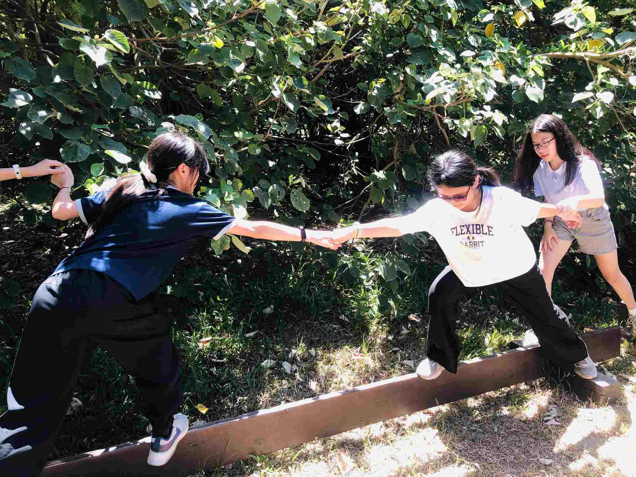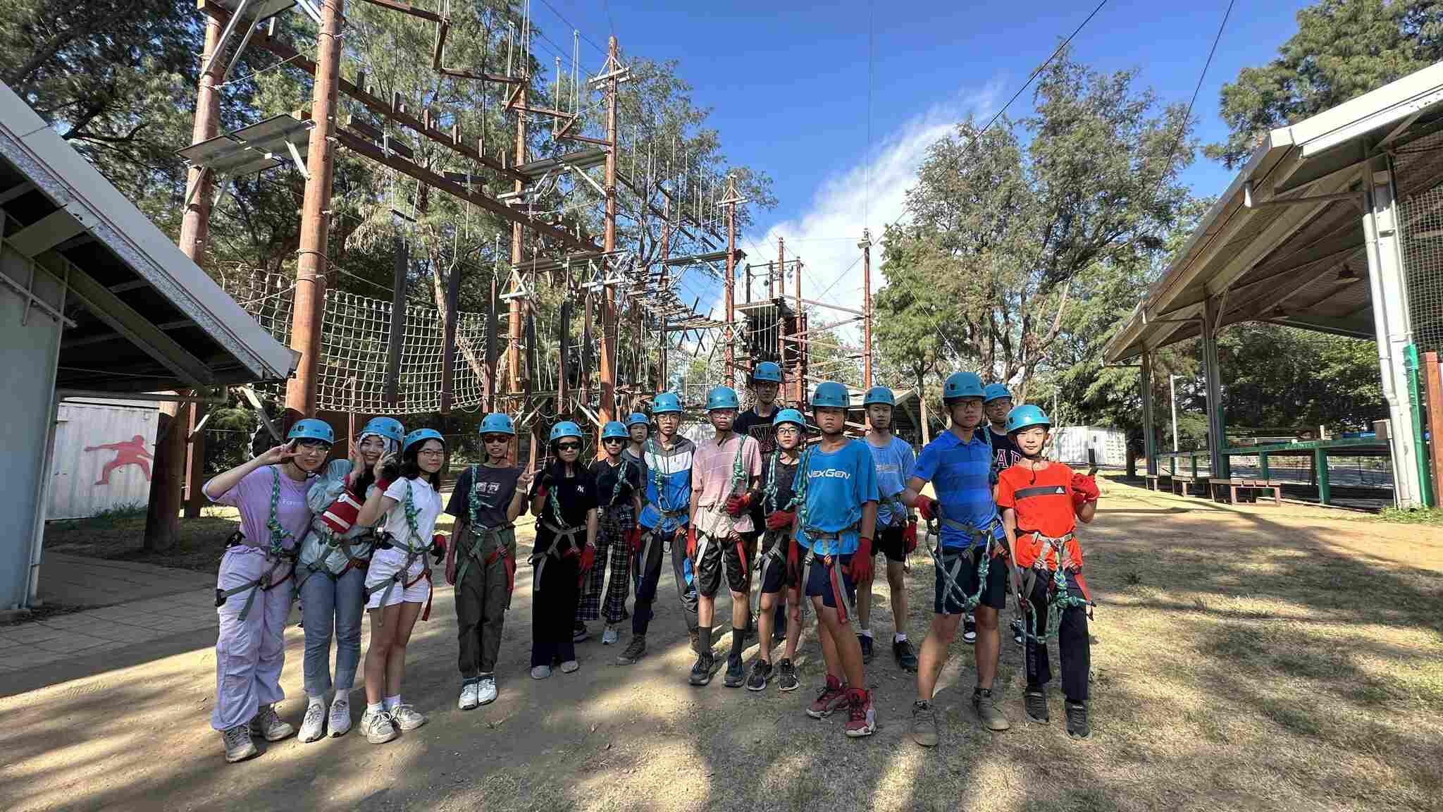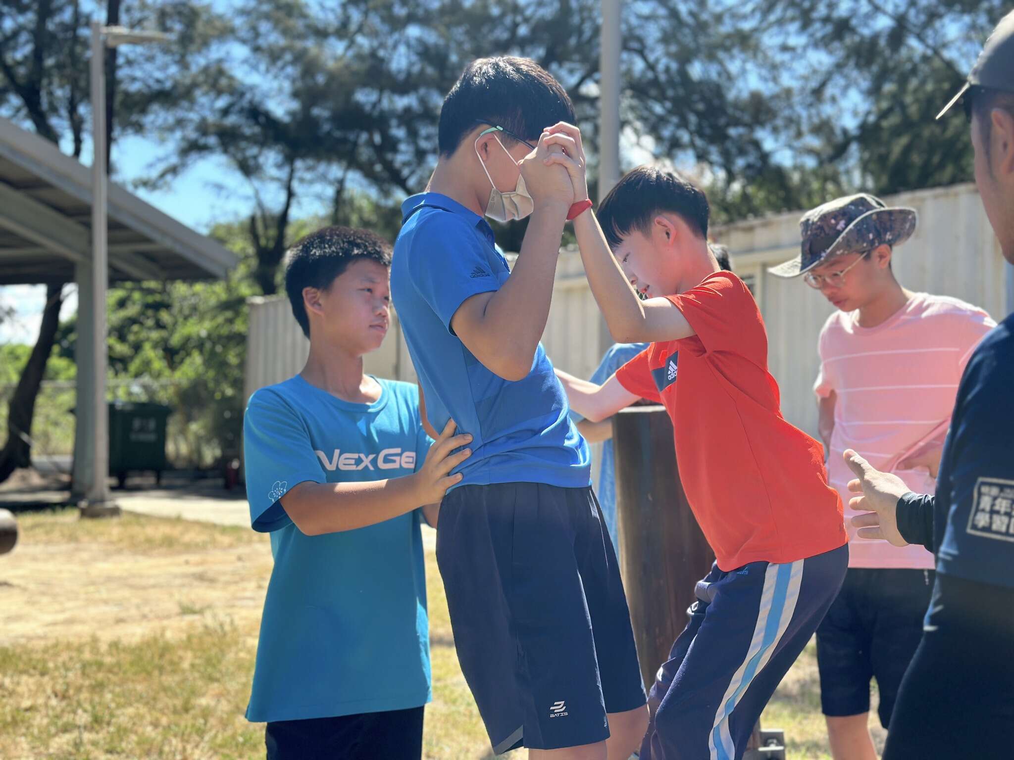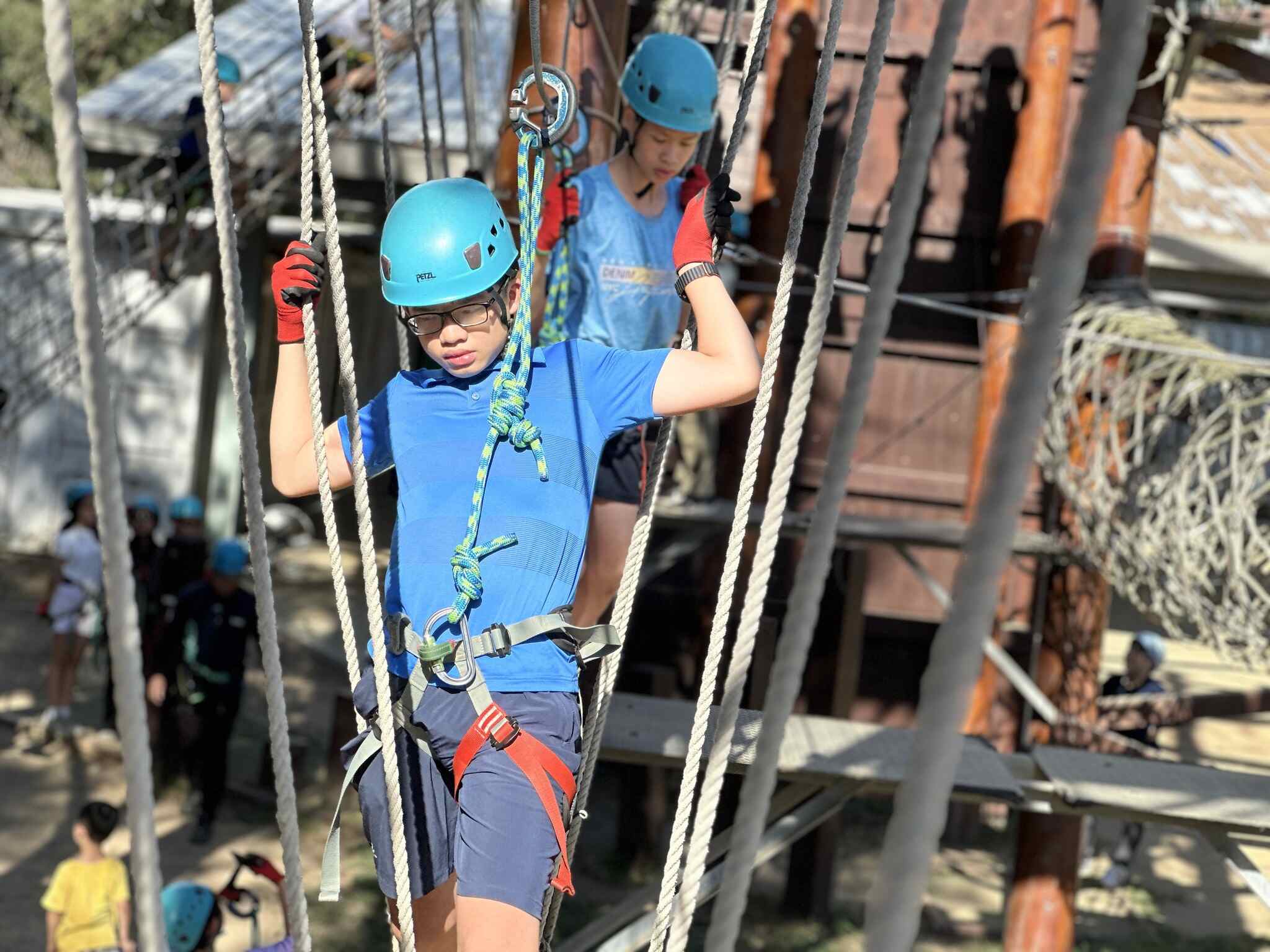 在場地中,有一個名為「自我確保」的設施,這個設施總共有三層,在一、二層時,也許是因為是在營隊的第一天,孩子們對設施有點不信任,也怕會有危險;但是!在第三天時,我們挑戰了第三層(大約有二層樓的高度)時,在孩子和老師的互相鼓勵下,連原本不敢挑戰的人、都勇敢地把第三層繞完!在過程中,比較快結束的孩子還走了第二圈,甚至去幫比較害怕的同學穩住設施,讓他們不會那麼擔心與害怕!