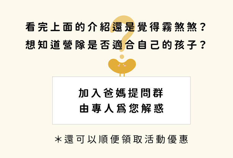 有哦!營隊開始前兩週,我們會創立一個「只有報名成功的家長才能加入」的LINE 群組,在這個群組中,爸爸媽媽有任何事都可以直接聯繫團隊,我們也會: