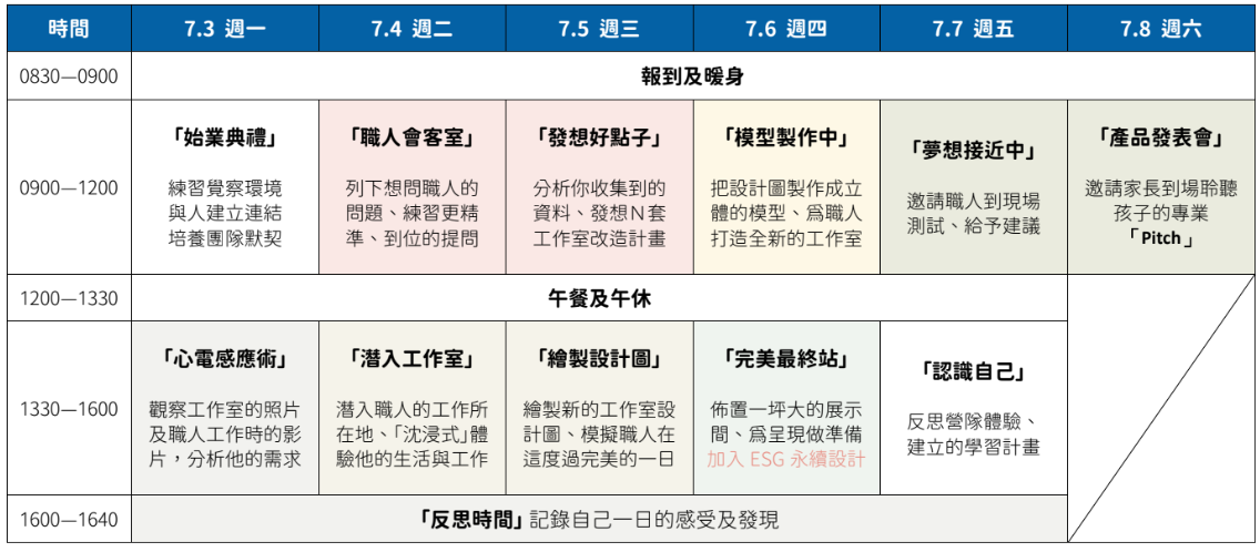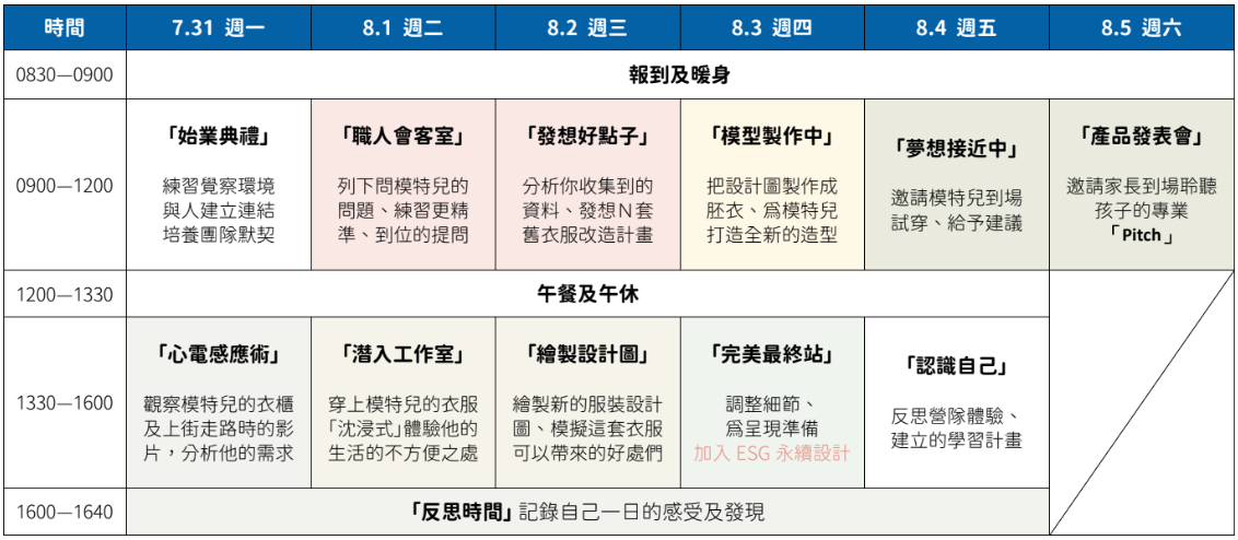 為六天不過夜營隊。每日早上 0900 開始課程、下午 1640 賦歸。