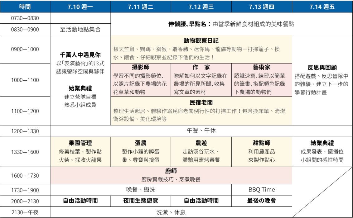 為五天四夜營隊,第五日 7 / 14 下午 1600 賦歸。