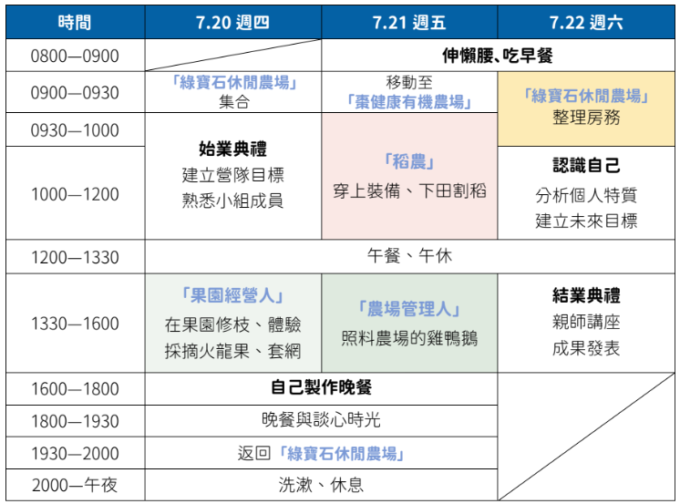 為三天二夜營隊,第三日 7 / 22 下午 1600 賦歸。