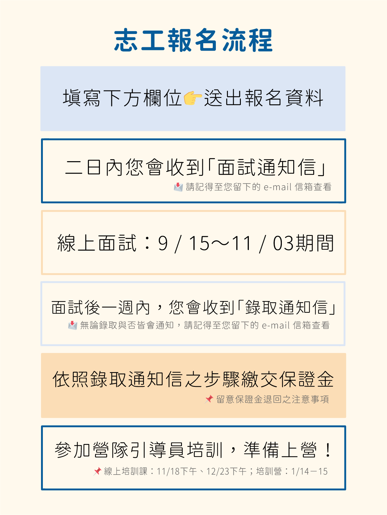 👉 能全程參與營隊引導員培訓、及擔任至少一場營隊的工作人員