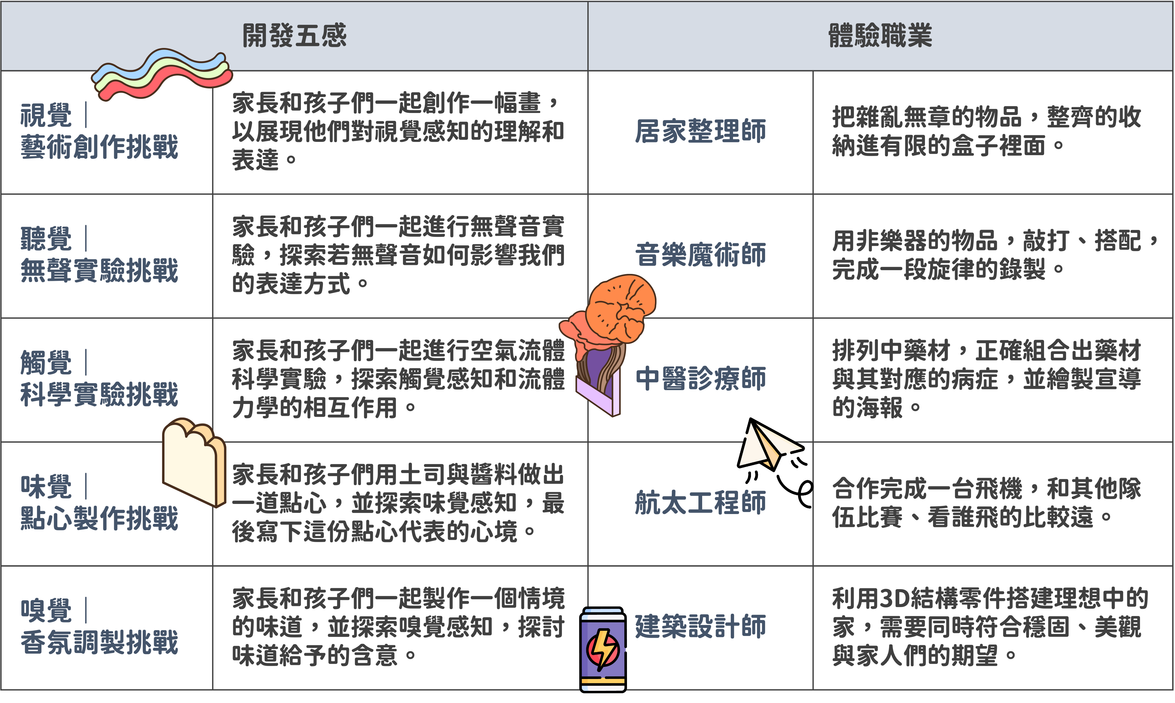 從視覺、聽覺、觸覺、嗅覺與味覺等感官出發,去探討家人過往的回憶、現在的溝通模式,使大人和小孩都更能體察到對方的需求,替往後家人間的相處加溫。