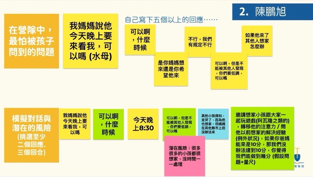 - 能化危機為轉機:在營隊現場,有各式各樣的突發情況,如何在第一時間掌握關鍵資訊,擬好解決方向和具體做法,是作為引導員的必修課。