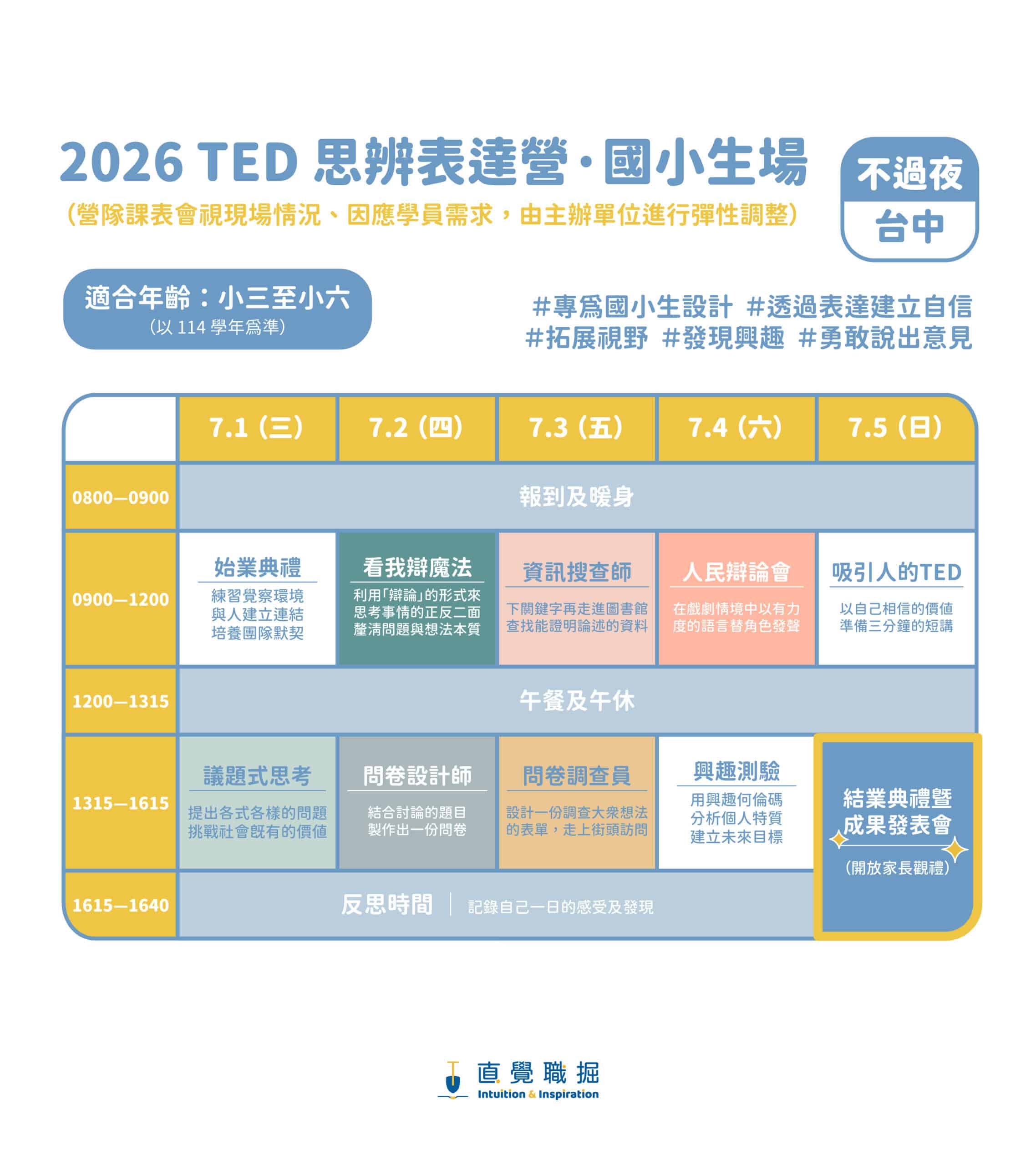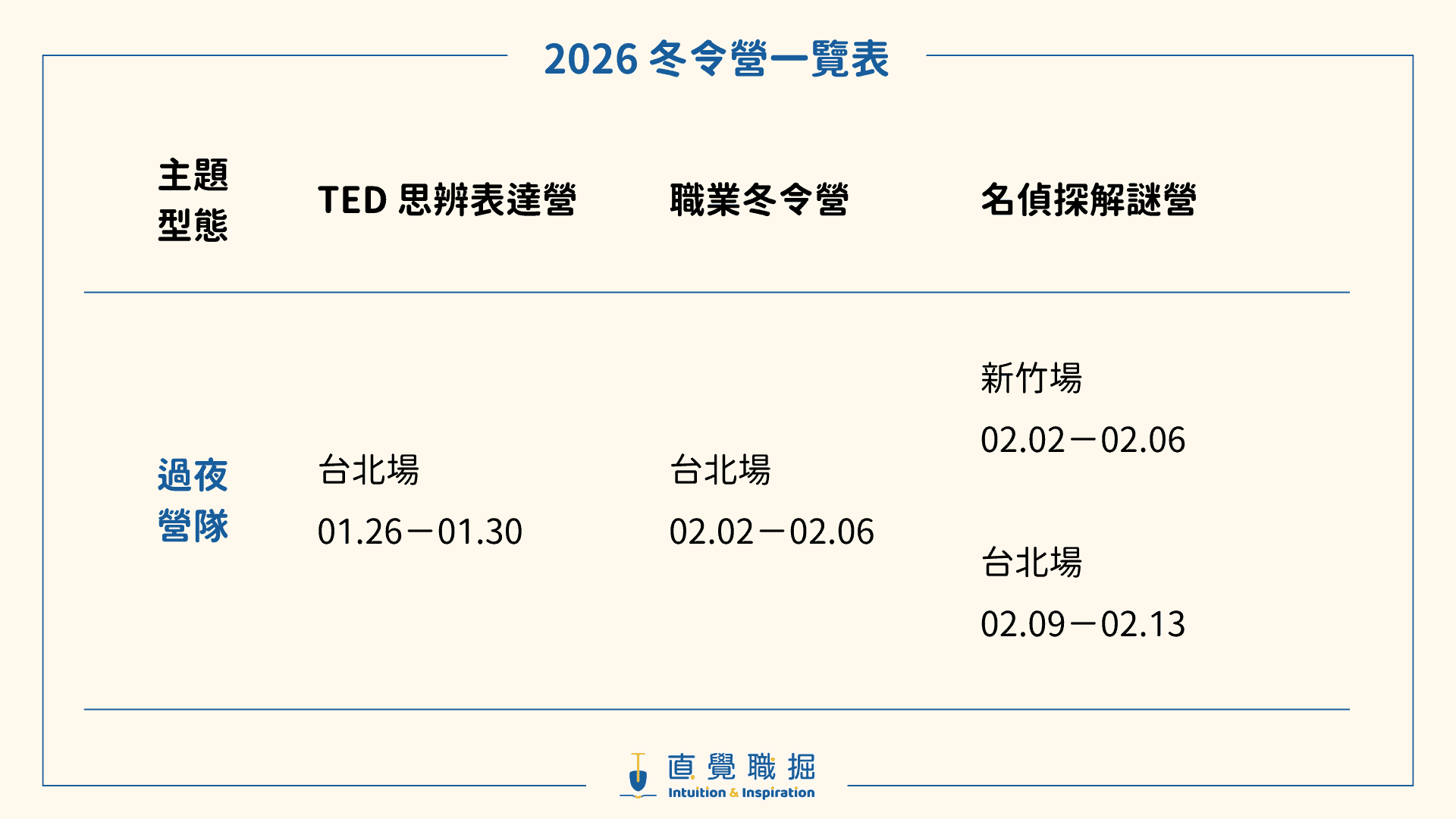 - TED 思辨表達營:全程擔任講師,帶領學生整理想法、進行討論與辯論,適合對口語表達與台風有自信的夥伴。