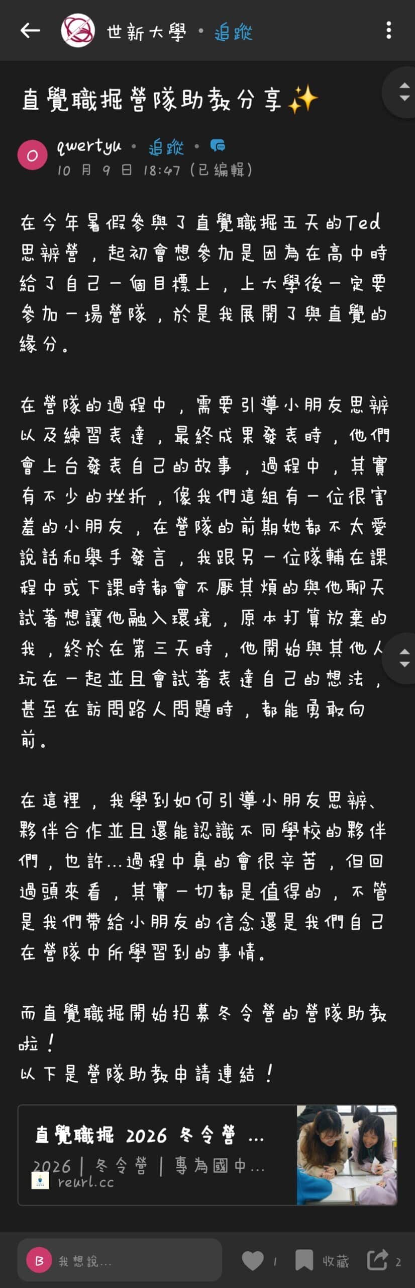 很慶幸自己決定、並且很認真的參與直覺職掘課程、活動和營隊,甚至和許多夥伴認識,對我來說是很棒的人生經驗!