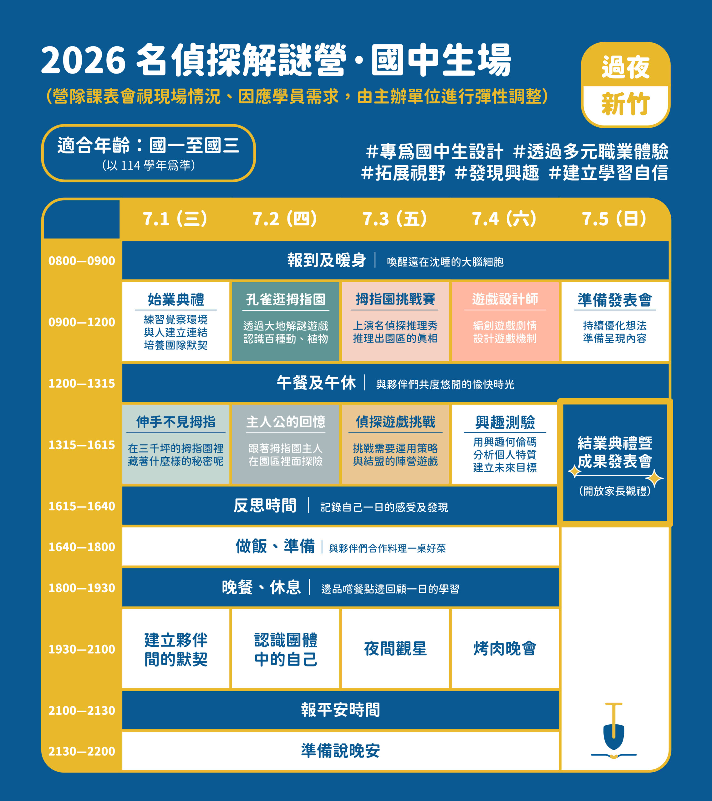 - 名偵探解謎營:帶領學生進行解謎與闖關活動,並需設計或調整遊戲內容,適合喜歡玩遊戲、能掌握節奏的夥伴。