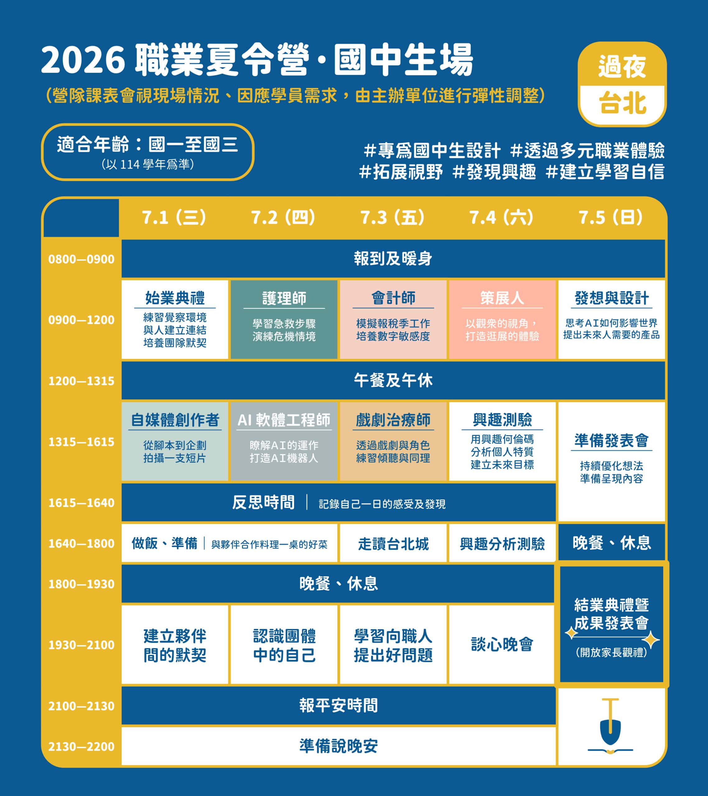 - 過夜營隊期間提供三餐、住宿;不過夜營隊提供午餐、零食