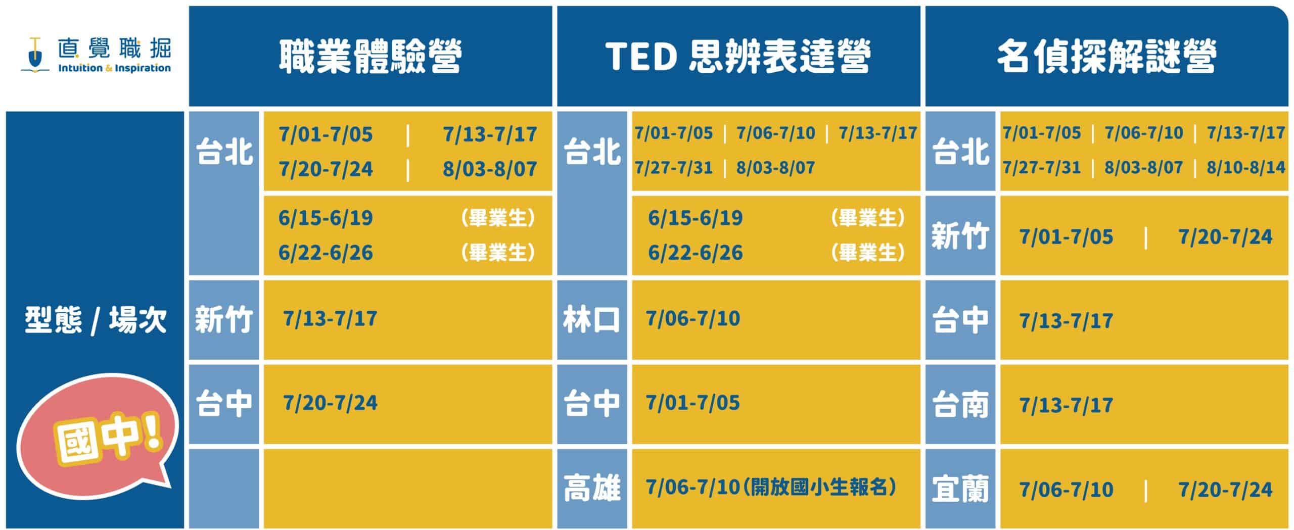 說明:每場營隊會有不同的職業體驗與課表,場次、課表詳情請見職業體驗營