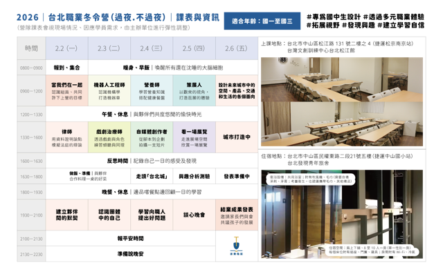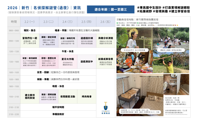 - 目前預計營期與場域(細節尚在規劃中!可以參考今年暑期營隊課表)
