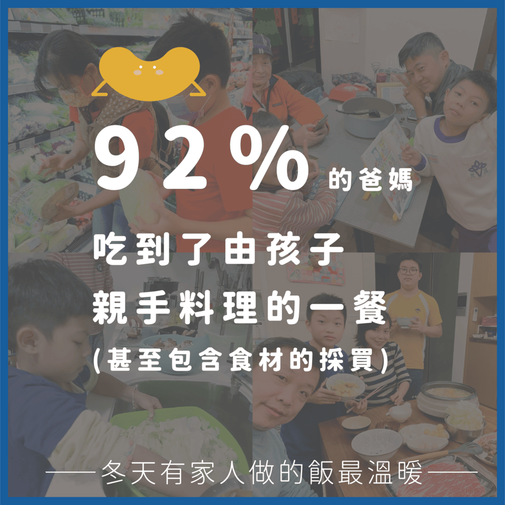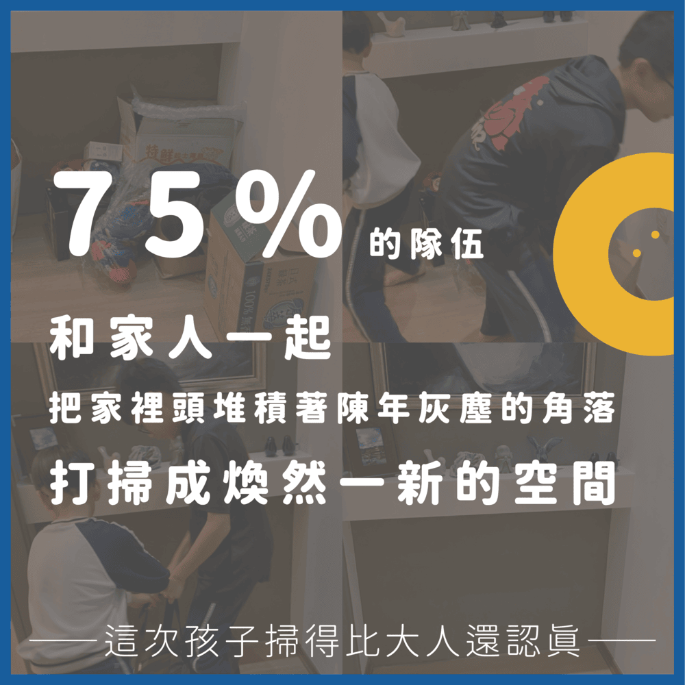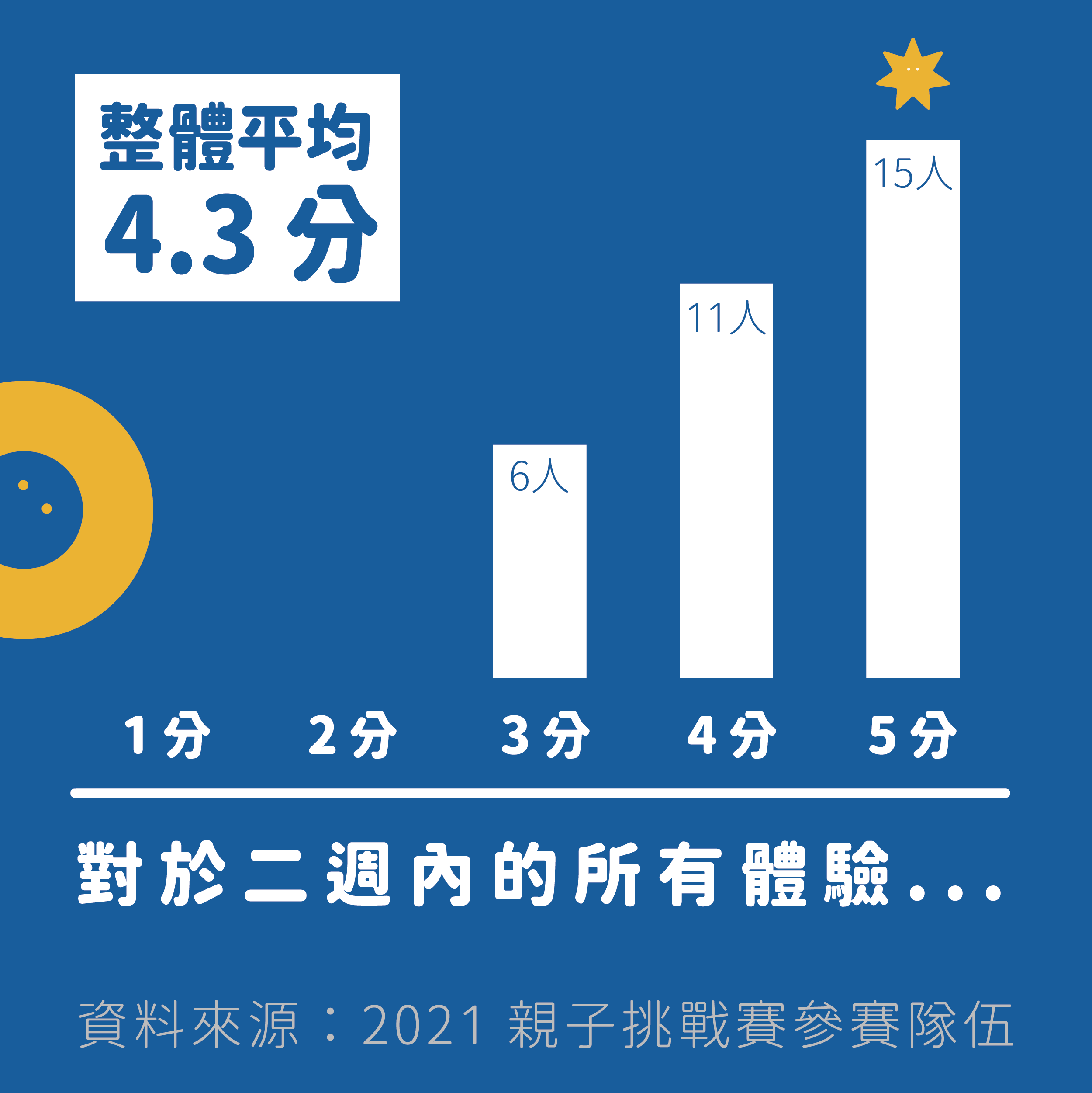 原以為孩子和家長在忙碌的生活中,會很難騰出時間實作任務、互相陪伴,或者因為繁雜的瑣事、動機低落。沒想到參賽隊伍們都以「完賽=完成所有任務」為最終目標,在短短二週的時間,所有參賽隊伍總計完成 120 個任務。也就是說,所有人花費約 3600 分鐘在陪伴家人,約莫是 60 個鐘頭,等於接近 2.5 個整天。