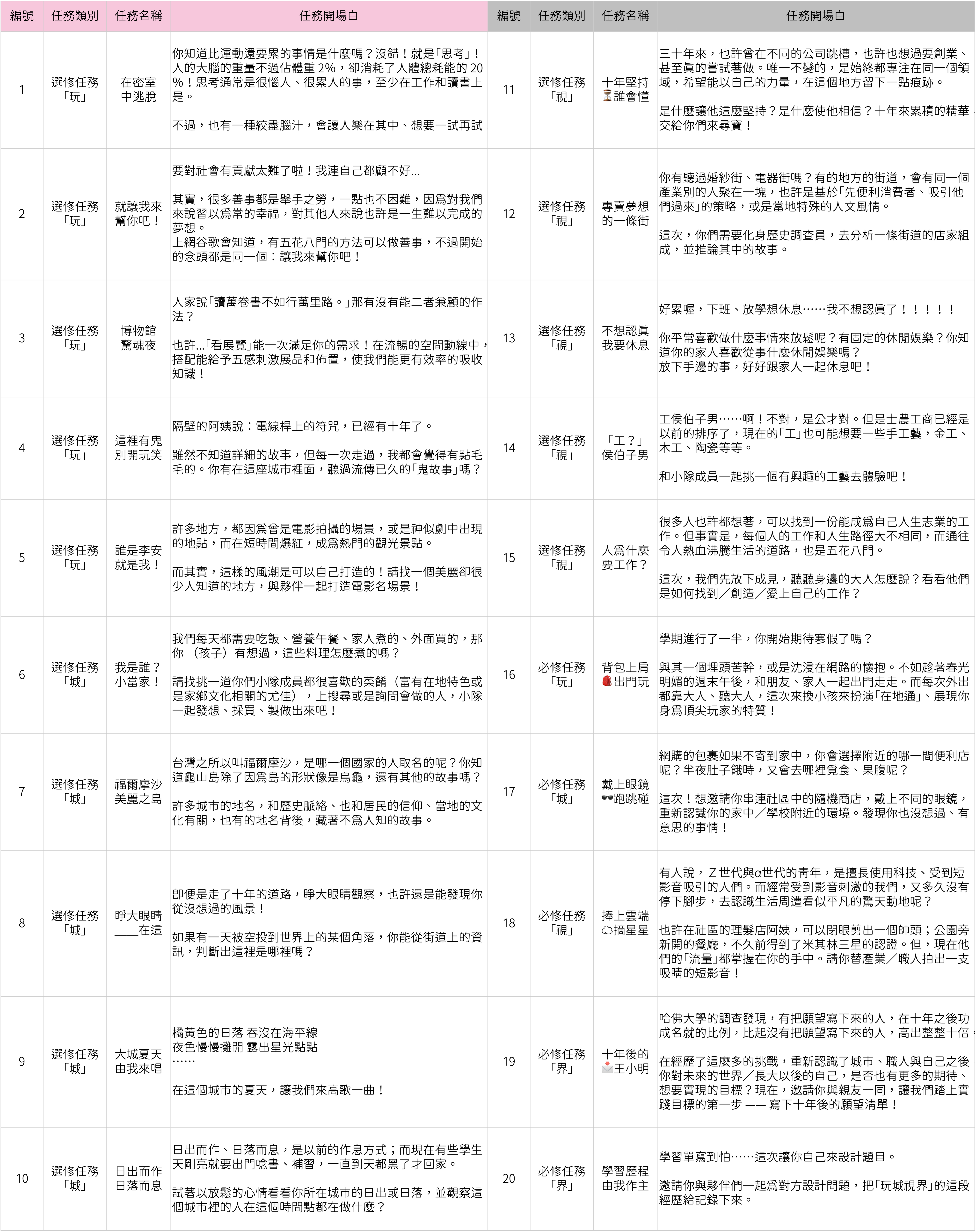 任務包含以上四項類別,共計二十個(含五項必修任務。)其他細節請見下方活動資訊與任務範例。