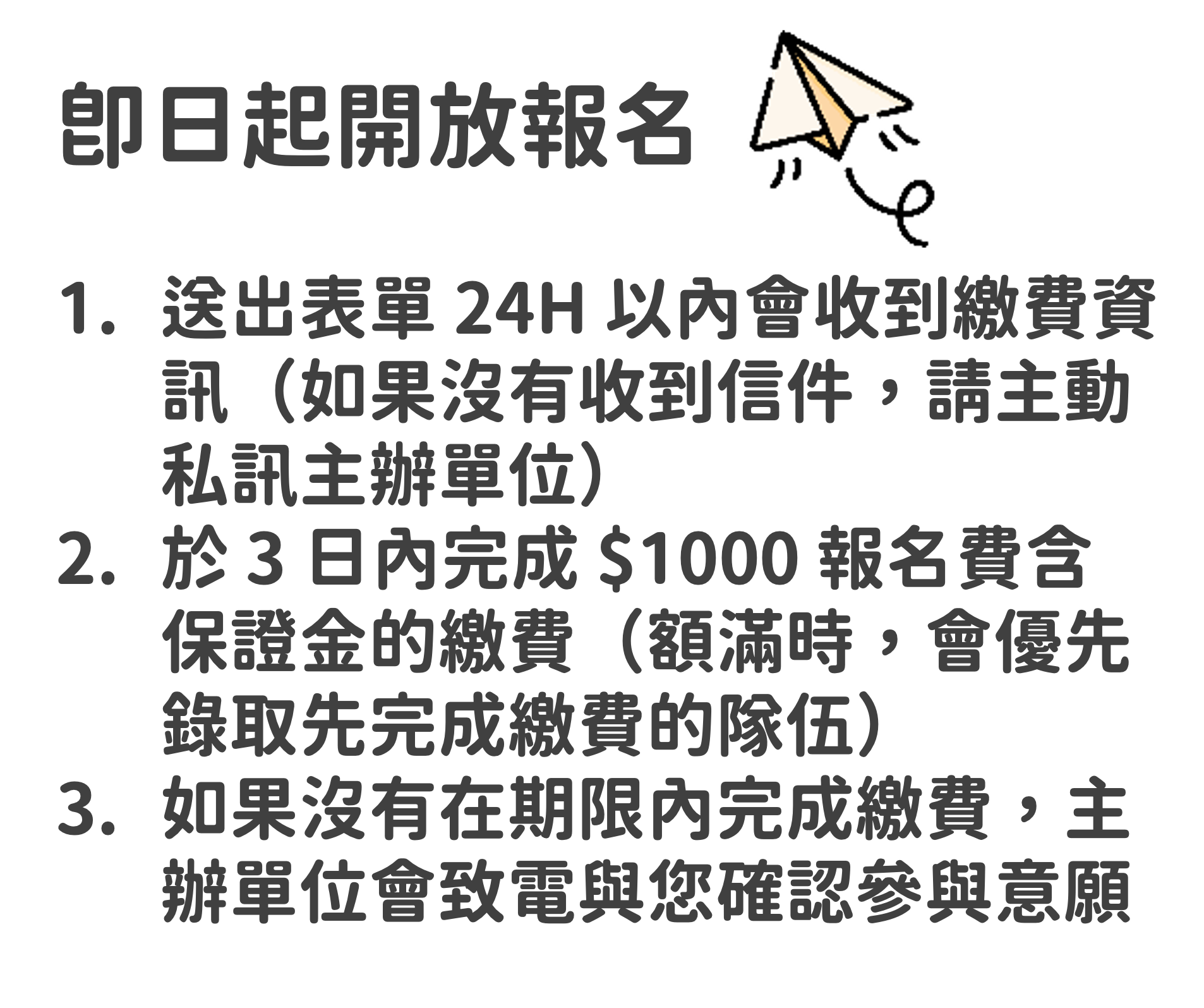 報名此活動的同時,必須同時同意活動期間所拍攝之參加者相片,做為後續花絮報導、集團行銷或社群露出宣傳使用。