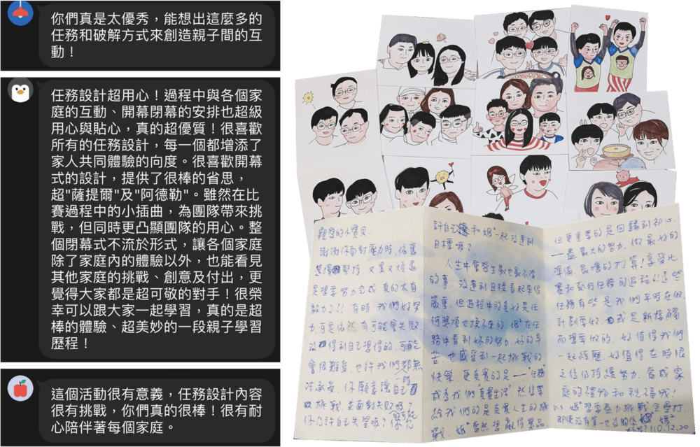 原以為孩子和家長在忙碌的生活中,會很難騰出時間實作任務、互相陪伴,或者因為繁雜的瑣事、動機低落。沒想到參賽隊伍們都以「完賽=完成所有任務」為最終目標,在短短二週的時間,所有參賽隊伍總計完成 120 個任務。也就是說,所有人花費約 3600 分鐘在陪伴家人,約莫是 60 個鐘頭,等於接近 2.5 個整天。