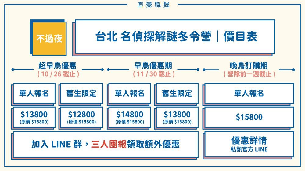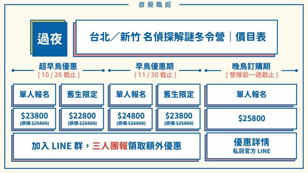 目前的最低優惠為「超 / 早鳥期間」的「三人團報」!和認識的朋友一起參與,孩子通常能更快的破冰、適應營隊的環境。