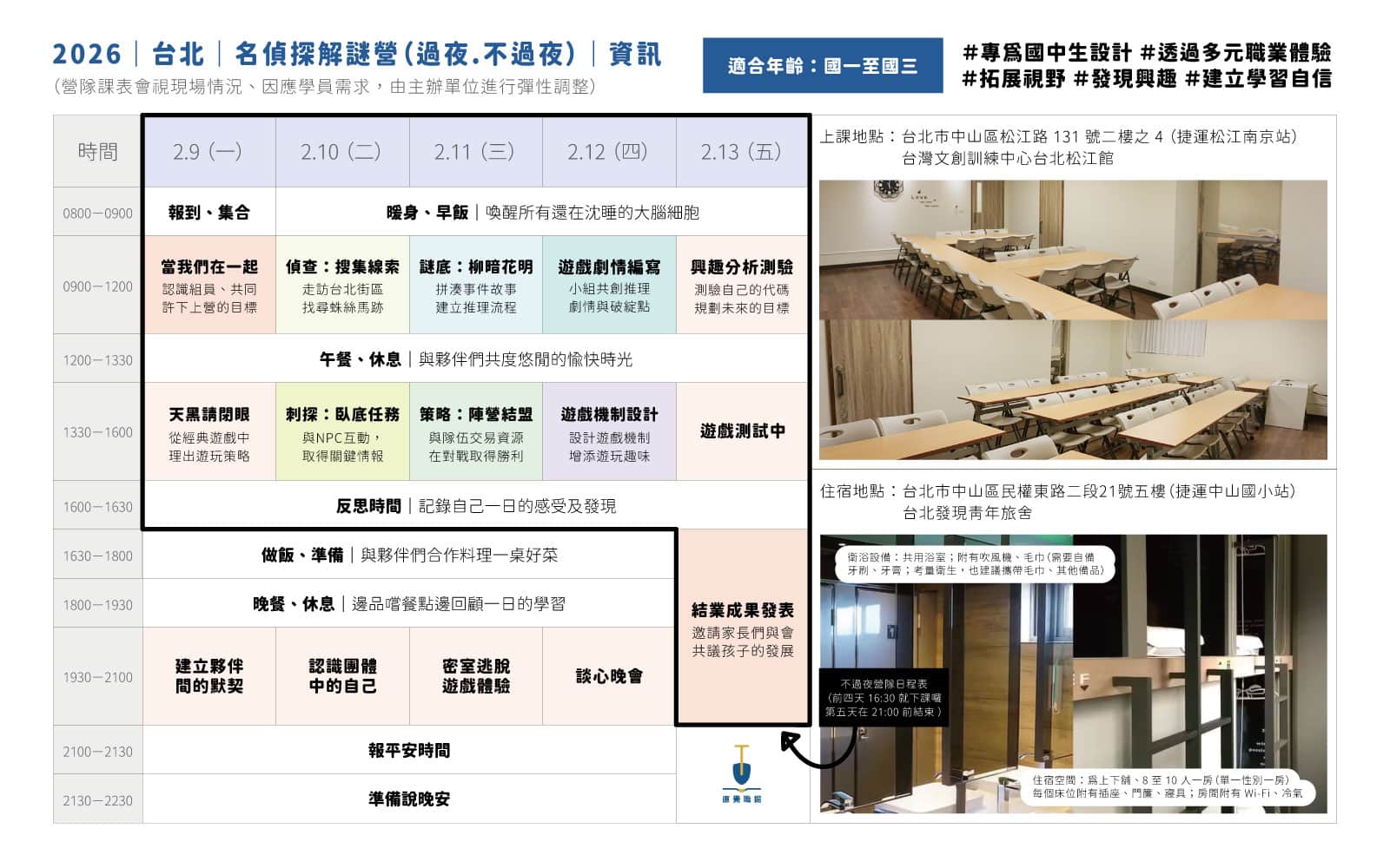 🔸 不過夜:每日 0830-1640 與最後一日晚上(1800-2100 為結業典禮,歡迎家長共同參與)