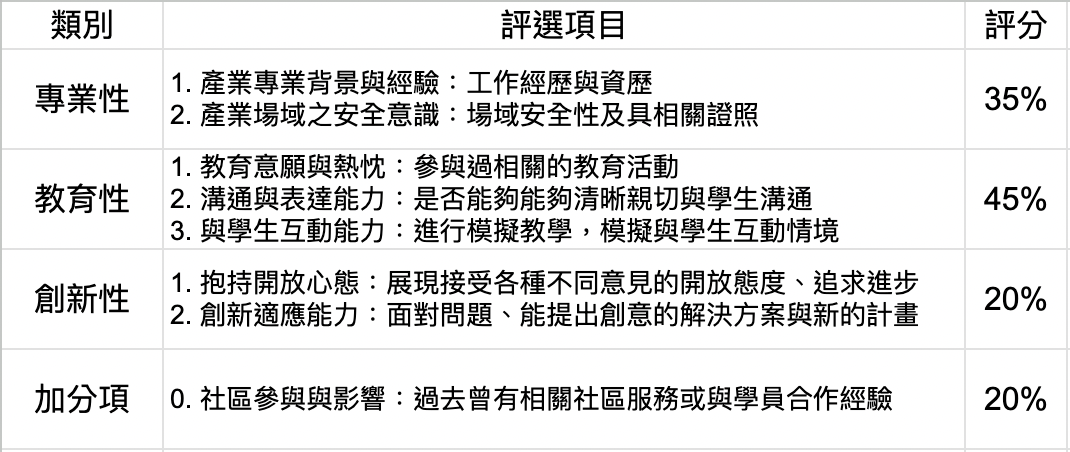 • 實習內容(建議方案、視情況調整):20% 傳授工作內容與相關知識原理 + 80% 實作活動