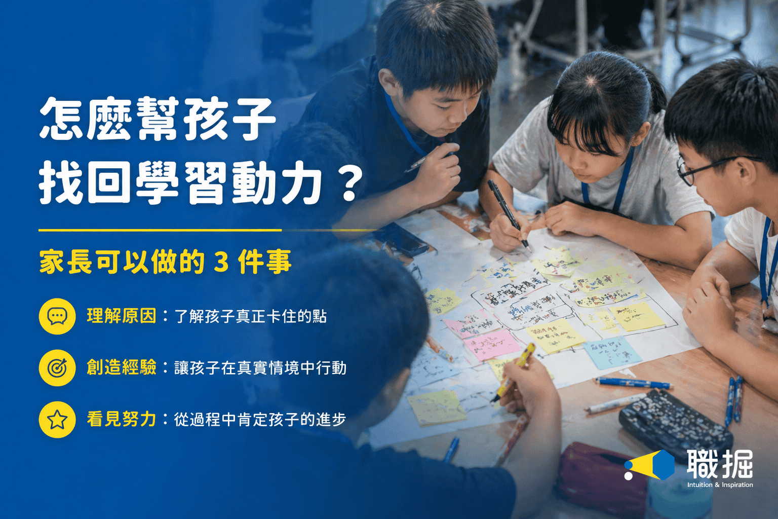 內在動機是孩子因為好奇、興趣、成就感或認同學習本身的價值,而願意主動投入行動的心理力量。孩子沒有學習動力,常常不是不努力,而是還沒在安全的環境裡找到「我做得到」的感覺。職掘相信「先行動,便會看見」,不是逼孩子立刻找到目標,而是讓孩子在真實體驗中先嘗試、再理解、最後慢慢看見自己。當孩子不再只是被要求讀書,而是能感覺到學習跟自己有關,動力才有機會重新長出來。