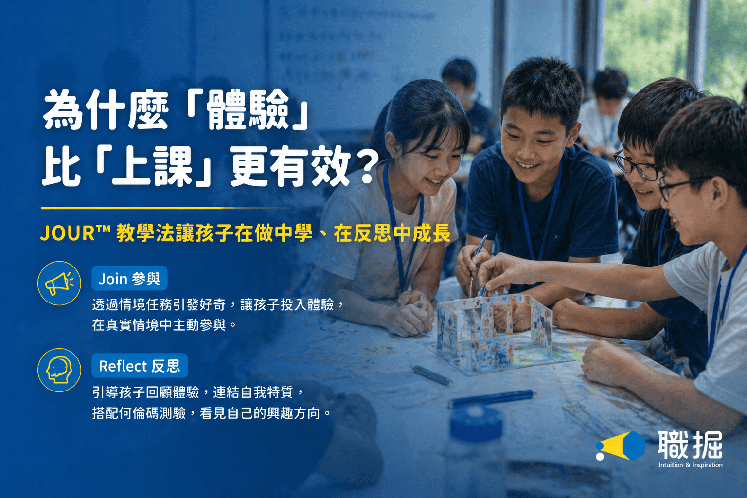 職掘的課程由台灣大學、政治大學及英美碩士團隊共同設計,透過 JOUR™ 教學法、體驗式學習與 Holland Code 何倫碼測驗,協助孩子把「我不知道」慢慢轉化成「我想再試一次」。我們相信,教育不是替孩子決定航向,而是陪伴孩子在生涯的大海中自主航行。