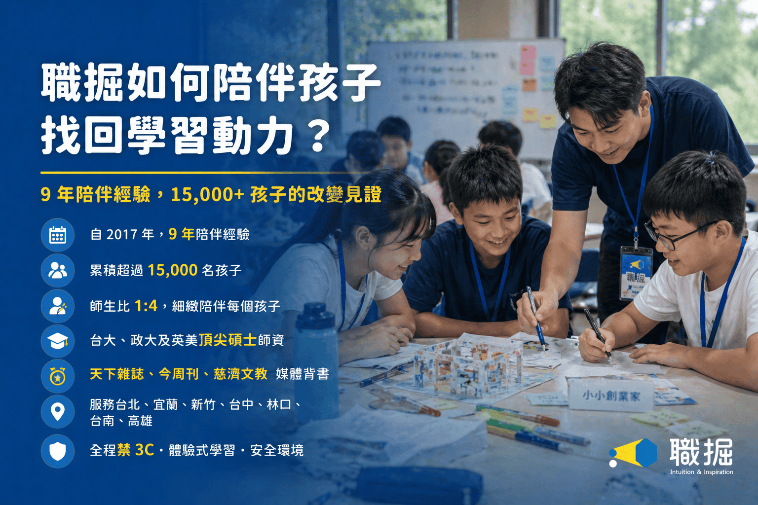 職掘回應孩子沒有學習動力的方式,不是先要求孩子變積極,而是設計讓孩子願意開始行動的環境。自 2017 年開始,職掘累積 9 年陪伴經驗,已陪伴超過 15,000 名孩子探索興趣與能力。課程採 1:4 師生比,讓孩子在小組中被看見,也讓老師能觀察孩子卡住、投入或發光的瞬間。