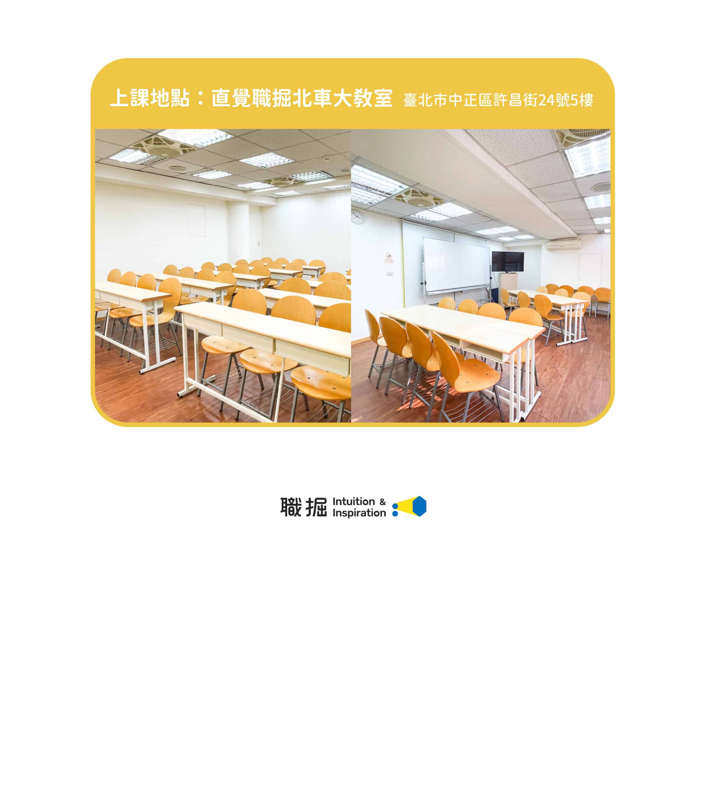 上課地點:直覺職掘北車大教室臺北市中正區許昌街24-4 號5樓