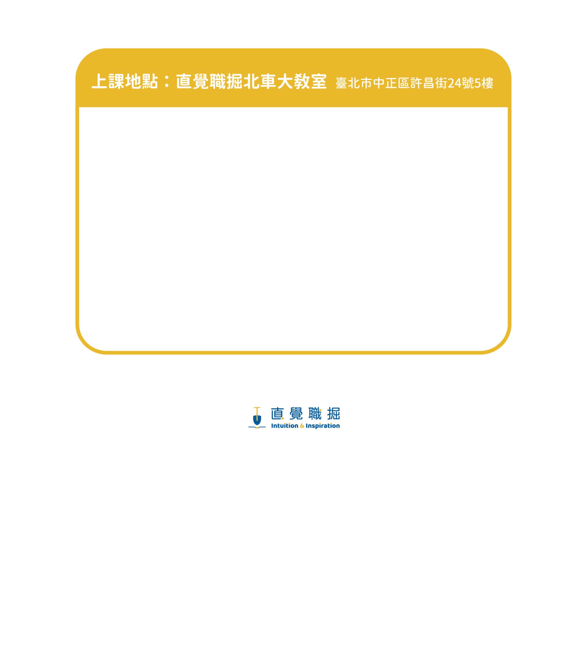 上課地點:直覺職掘北車大教室(臺北市中正區許昌街 24 號 5 樓)