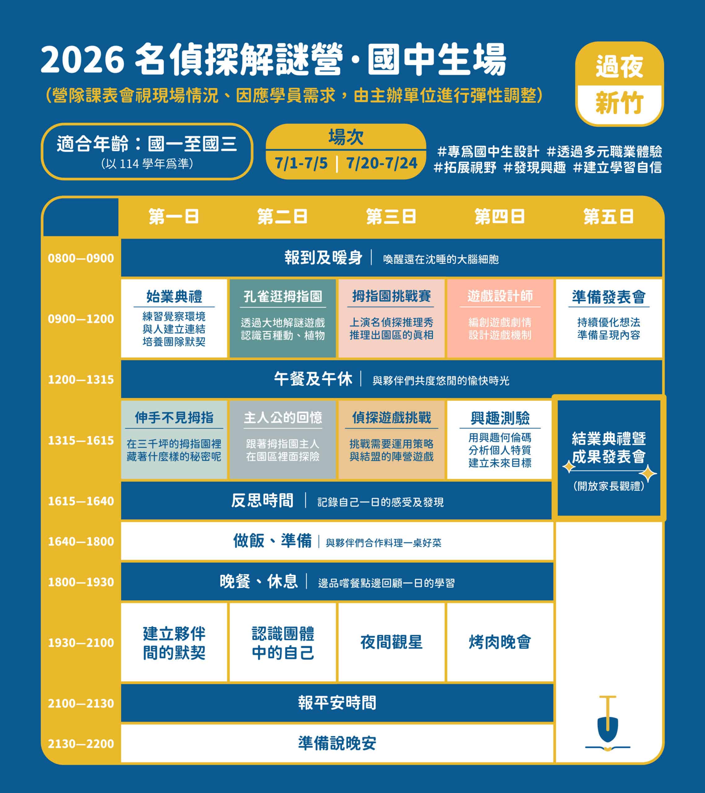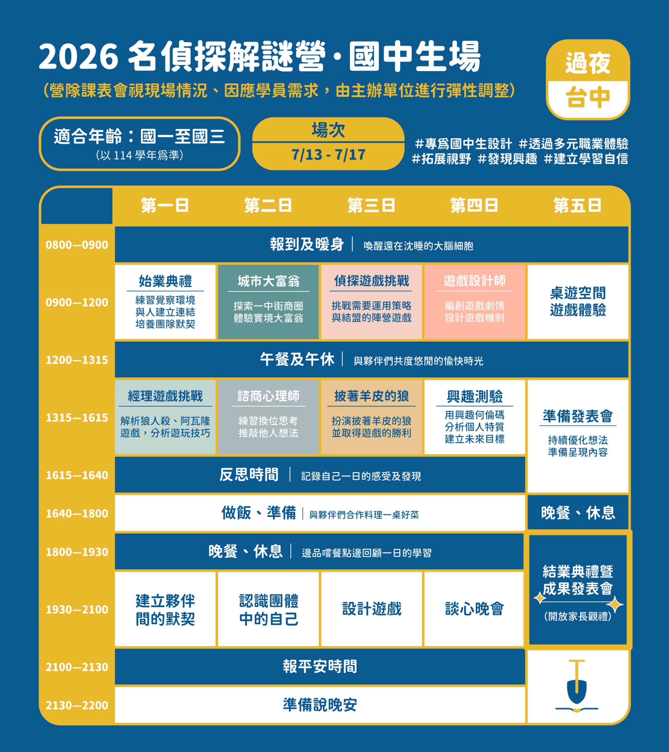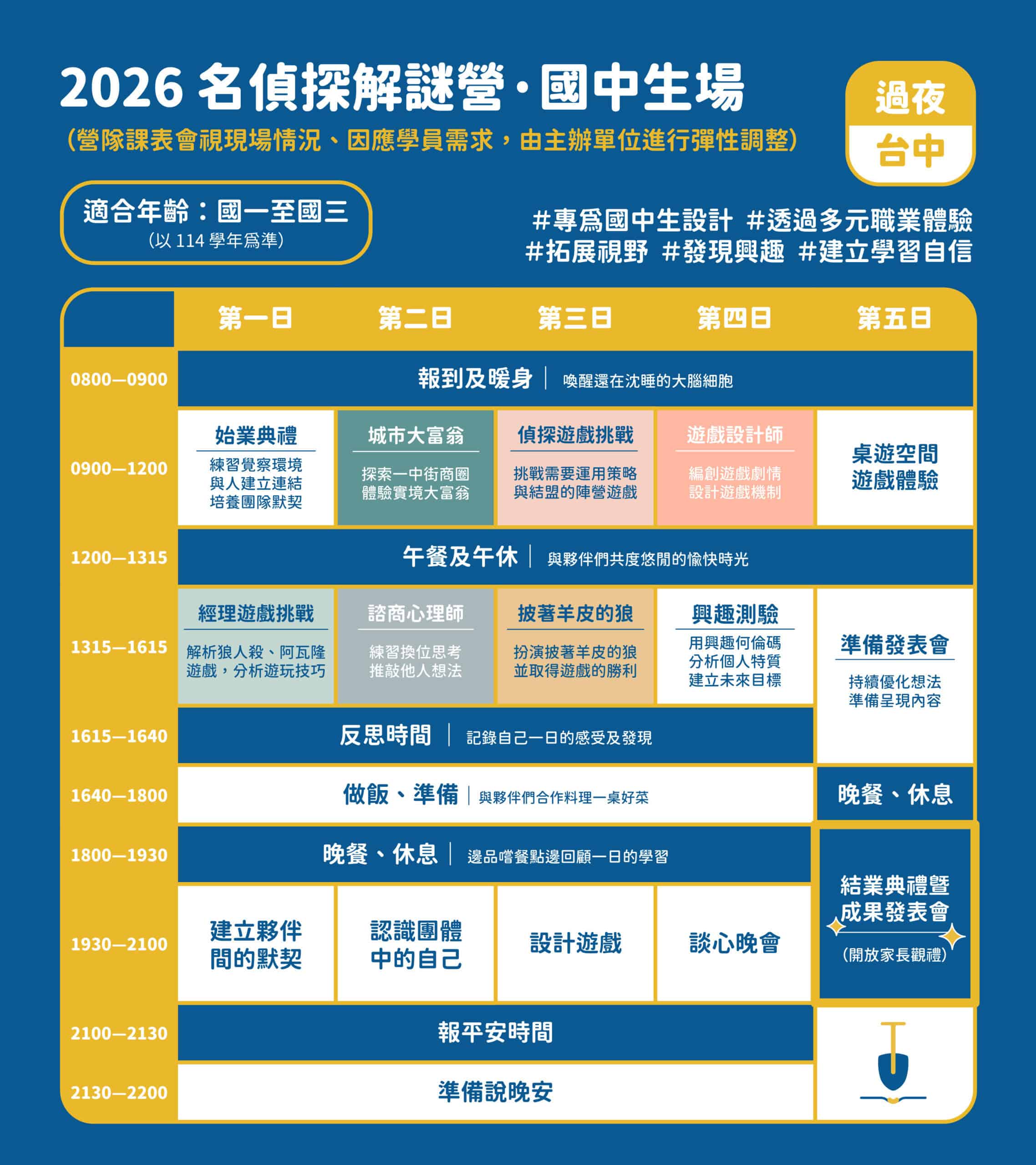 從玩家華麗轉身為設計師!在每日的反思與興趣測驗後,孩子將發揮天馬行空的創意,親手設計一場結合空間與劇情的「劇本殺」。在結業式上,邀請家長成為玩家,親自體驗孩子設計的燒腦遊戲。