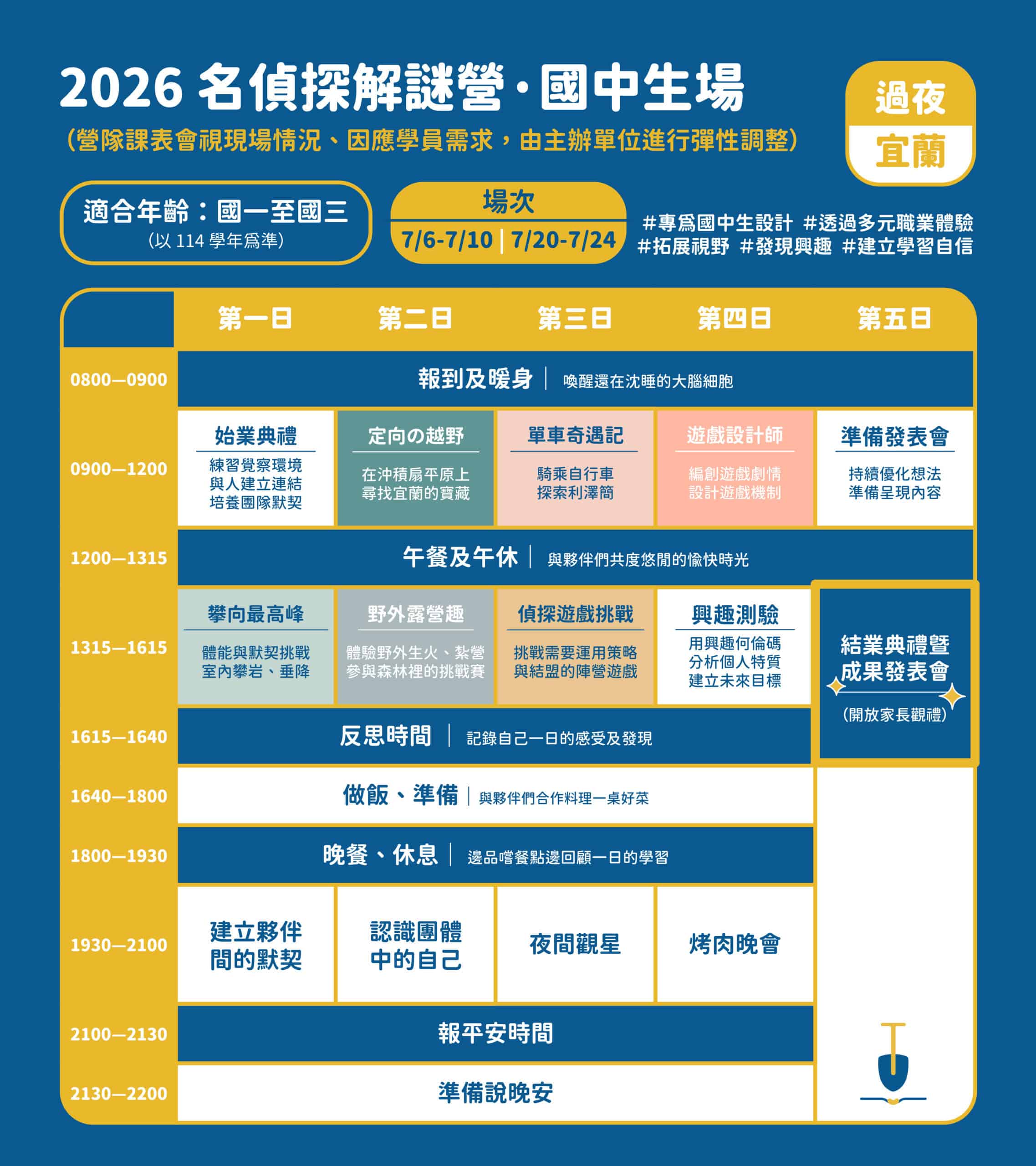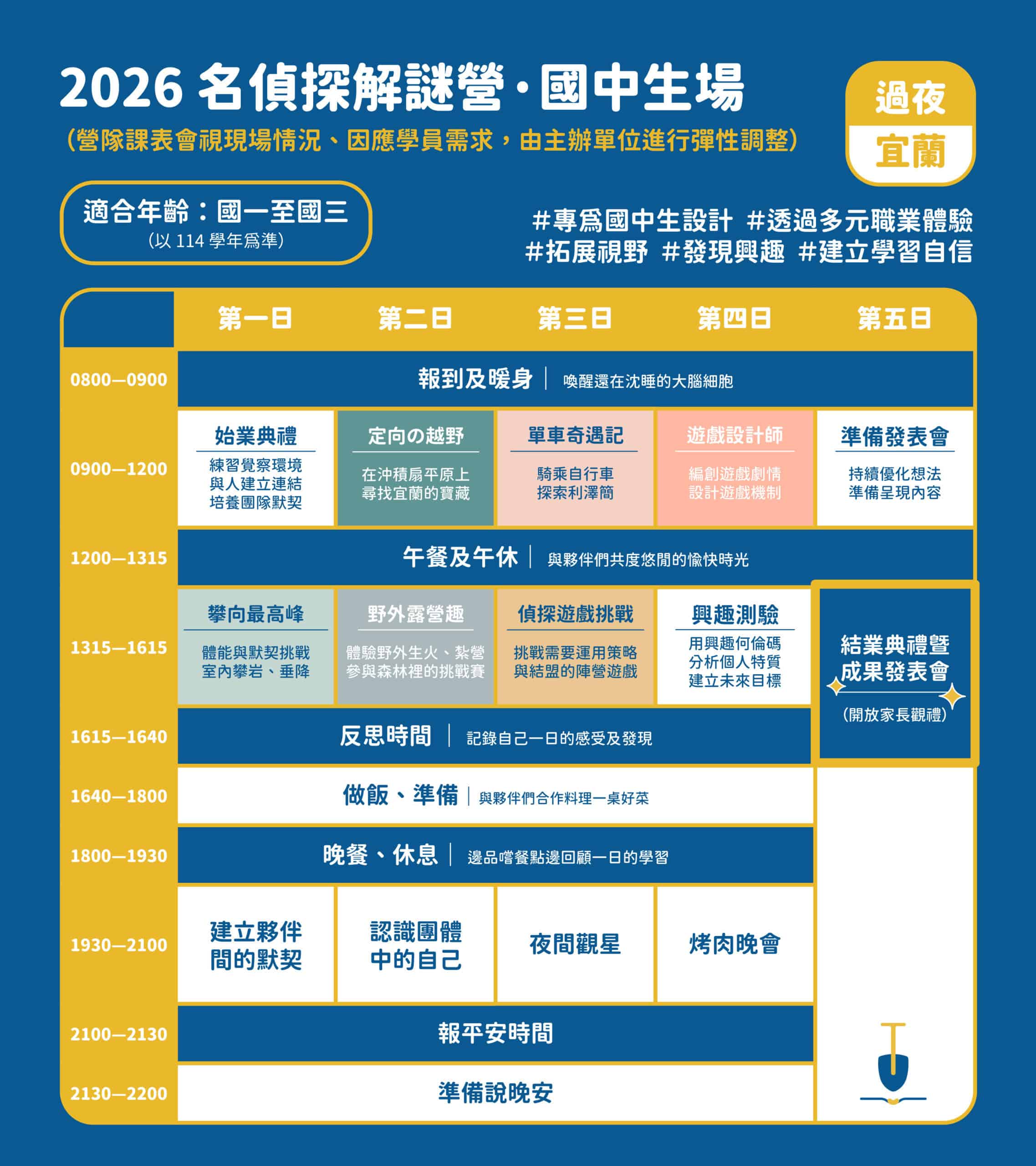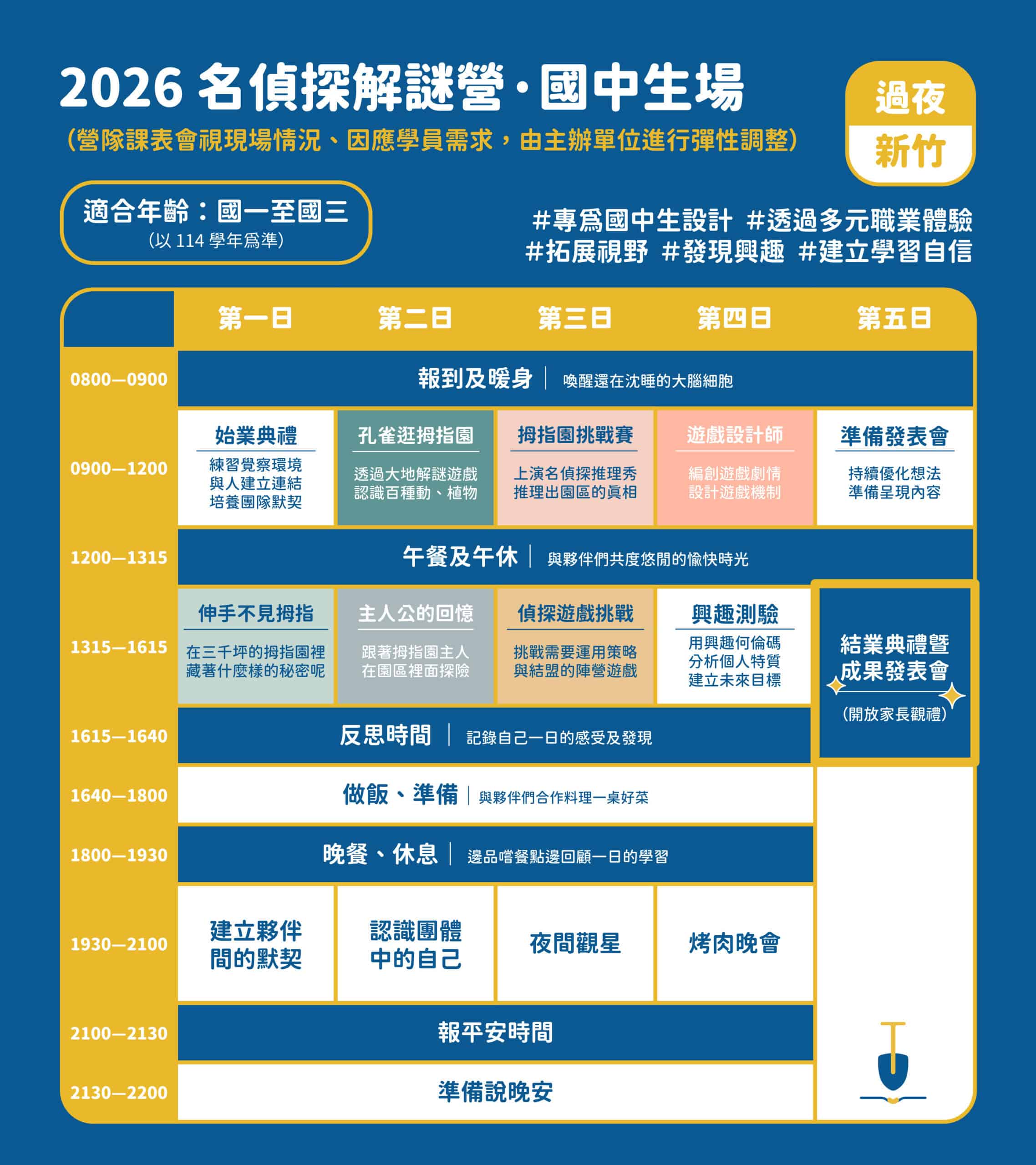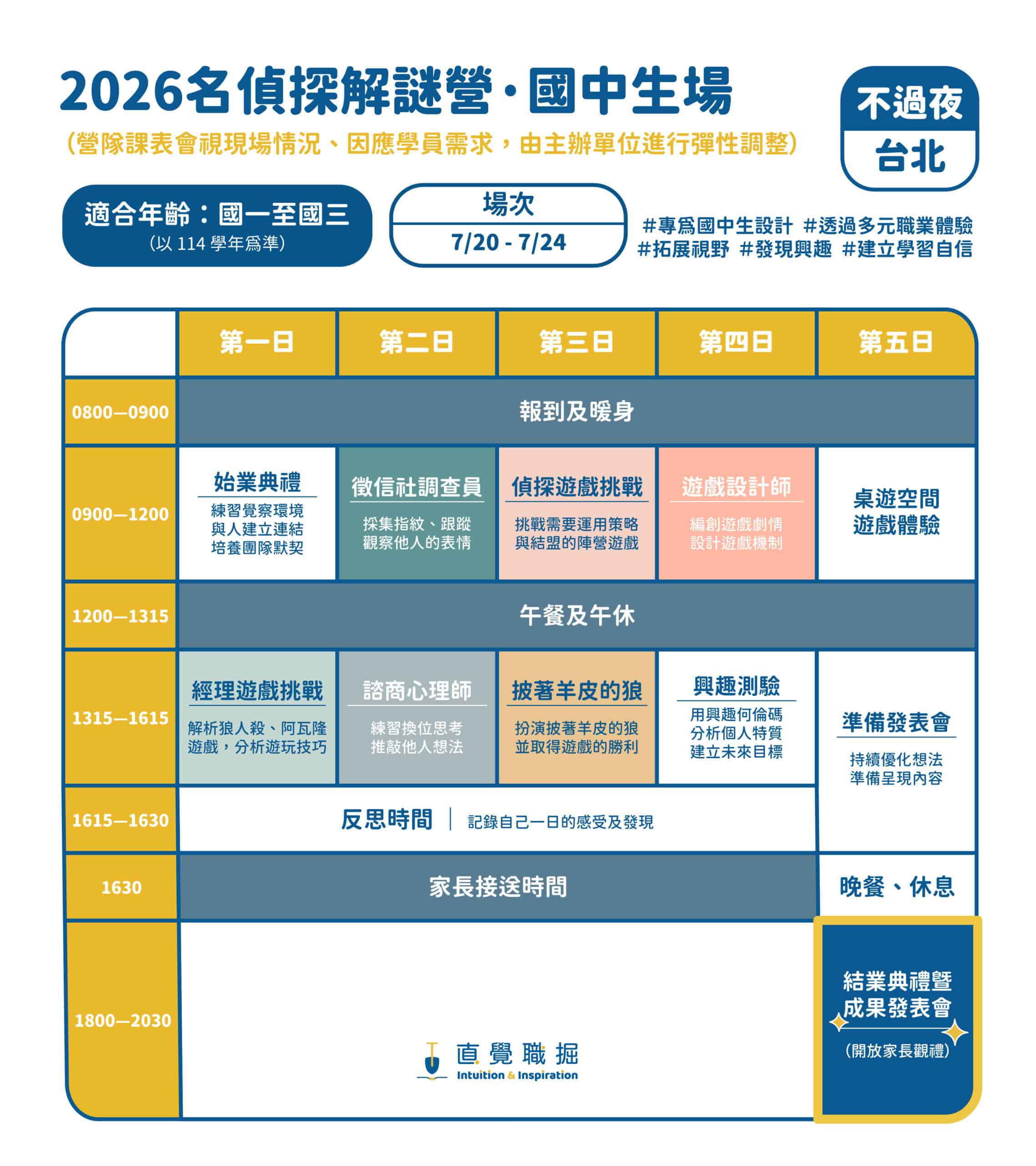 從玩家華麗轉身為設計師!在每日的反思與興趣測驗後,孩子將發揮天馬行空的創意,親手設計一場結合空間與劇情的「劇本殺」。在結業式上,邀請家長成為玩家,親自體驗孩子設計的燒腦遊戲。