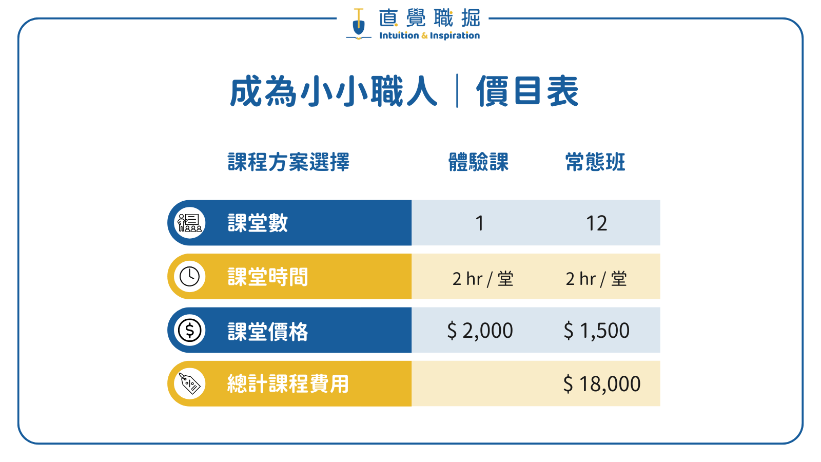 | 課程類型 | 單堂體驗課, 12 堂套課(3 年內皆可補課) |